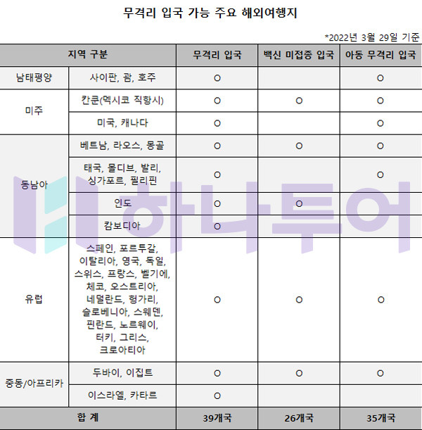 | ▲ 무격리 입국 가능 주요 해외 여행지 [하나투어 제공. 재판매 및 DB 금지] |
