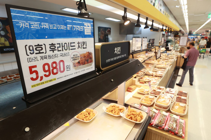 이후 대형마트 델리코너에서는 1만원 안팎 가격으로 치킨을 판매해 왔지만 최근 먹거리 물가가 고공행진하는 상황에서 홈플러스가 6월 말에 6천980원이라는 '파격적'인 가격을 제시하면서 관심이 커지기 시작했다.
