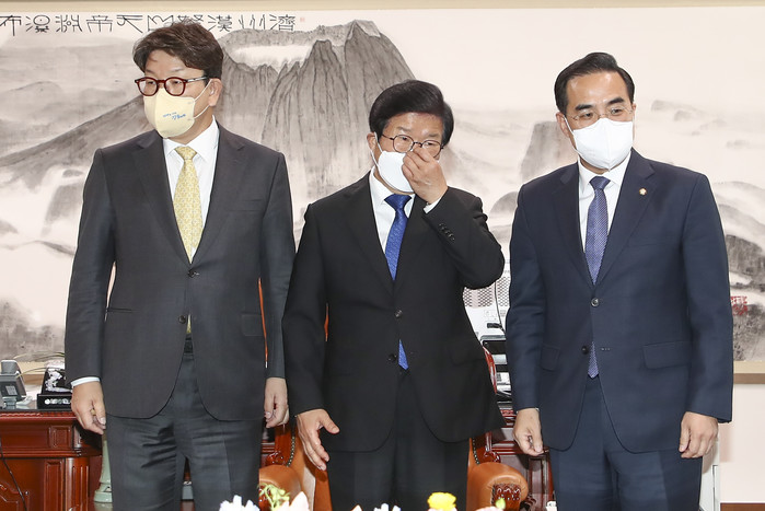 | ▲ 박병석 국회의장(가운데)과 국민의힘 권성동 원내대표(왼쪽), 더불어민주당 박홍근 원내대표(오른쪽)가 19일 국회 의장실에서 열린 양당 원내대표 회동에서 기념촬영을 한 뒤 자리로 이동하고 있다. 2022.4.19 [국회사진기자단] |