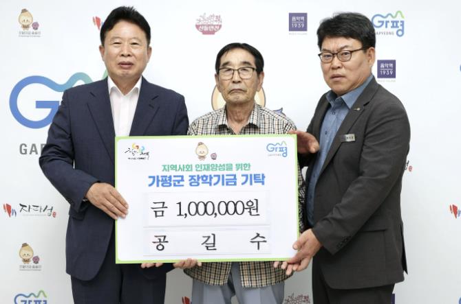 [코리아 이슈저널=홍춘표 기자] 잣이야기농원 공길수 대표는 17일 가평군청을 찾아 장학금 100만원을 기탁했다. 공 대표는 지난해에 이어 올해도 장학기금을 전달하며 지역 인재 육성에 대한 꾸준한 관심을 보여주고 있다.