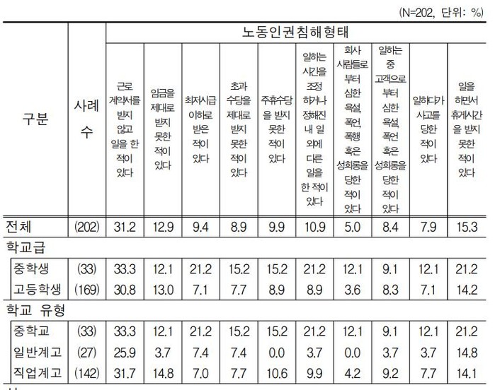 학교급별로 중학생은 2.8%, 고등학생은 11.7%, 학교 유형별로는 일반고 3.7%, 직업계고 19.9%, 성별로는 남학생 9.1%, 여학생 6.4%가 아르바이트 경험이 있었다.