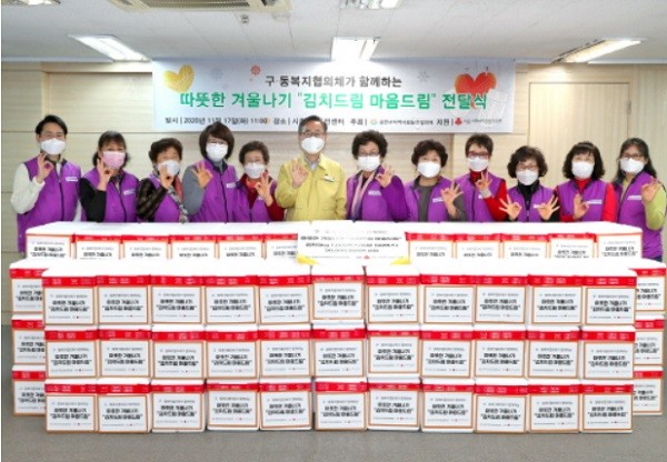 먼저 구·동복지협의체에서 지난 16일 가산동을 시작으로 19일까지 10개 동에 김치 5㎏ 총 1천 박스(동별 100박스씩)를 전달했다.