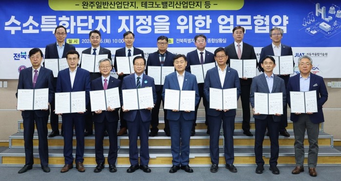 이번 협약식은 전북의 수소산업 인프라와 기업 집적도를 바탕으로, 완주군 봉동읍 일대 산업단지의 수소특화단지 구축과 수소 상용모빌리티 산업 육성의 협력체계를 모색하고자 마련됐다.