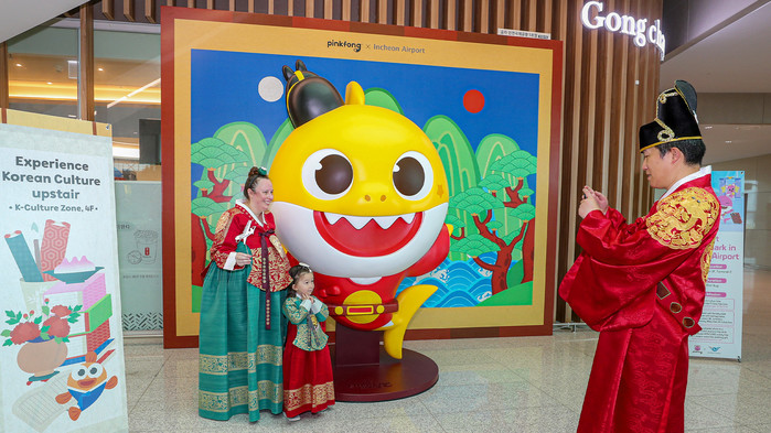 [열린의정뉴스 = 김윤영 기자] 인천국제공항공사가 더핑크퐁컴퍼니와 협업하여 글로벌 인기 캐릭터 핑크퐁과 아기상어를 활용한 환승객 대상 공동마케팅을 시행한다고 19일 밝혔다. 사진은 지난 18일 인천공항 제2여객터미널 면세지역에 위치한 아기상어 오프라인 포토존에서 외국인 가족이 한복체험을 하면서 아기상어와 기념 촬영을 하는 모습. 2022.8.19 [인천공항공사 제공. 재판매 및 DB 금지]