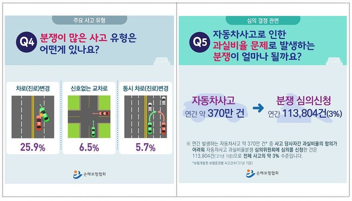 손해보험협회는 과실비율분쟁 심의 결과를 분석한 내용을 카드뉴스로 제작해 과실비율정보포털, 과실비율분쟁심의원회 카카오톡 채널, 소셜미디어에 공개했다.