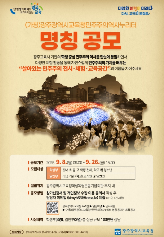 [코리아 이슈저널=김종오 기자] 광주시교육청이 새롭게 건립하고 있는 민주주의 전시·체험공간 ‘(가칭)광주광역시교육청민주주의역사누리터의 명칭을 공모한다.