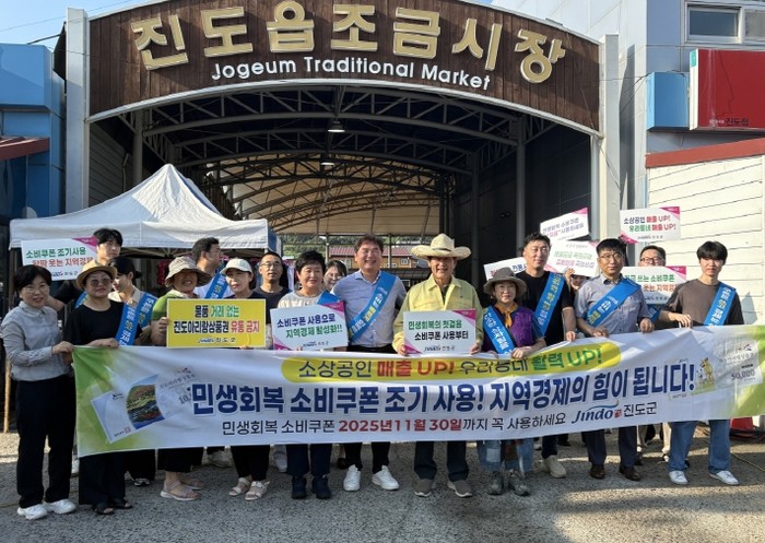 [코리아 이슈저널=김종오 기자] 진도군이 민생회복 소비쿠폰의 조기 사용을 촉진하고 전통시장과 골목상권에 활력을 불어넣기 위해 27일 진도읍 조금시장 일원에서 운동(캠페인)을 진행했다.