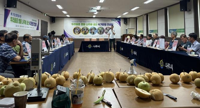 [코리아 이슈저널=김종오 기자] 전라남도 나주시는 지난 22일 나주 APC 2층에서 시장인증 품질 보증배 참여 농가 30명을 대상으로 우리 품종 숙기 판정 컨설팅을 개최했다.