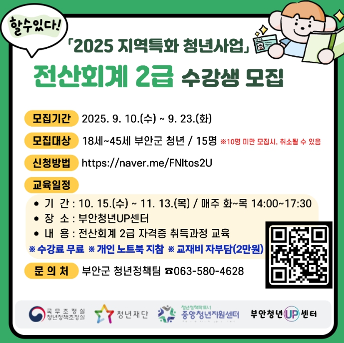 | ▲ 부안청년UP센터, 전산회계 2급 자격증반 수강생 모집 |