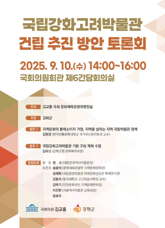 [코리아 이슈저널=홍춘표 기자] 강화군은 김교흥 국회의원실에서 주최하고, 강화군이 주관하는 '국립강화고려박물관 건립 추진 방안 토론회'가 오는 9월 10일 국회의원회관 제6간담회실에서 열린다고 밝혔다.