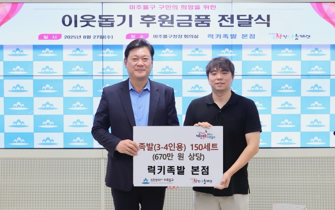 [코리아 이슈저널=홍춘표 기자] 인천 미추홀구는 27일 구청장실에서 럭키족발 본점(대표 이호현)으로부터 지역 내 저소득 가구 지원을 위한 족발 150세트(3~4인용)를 전달받았다.