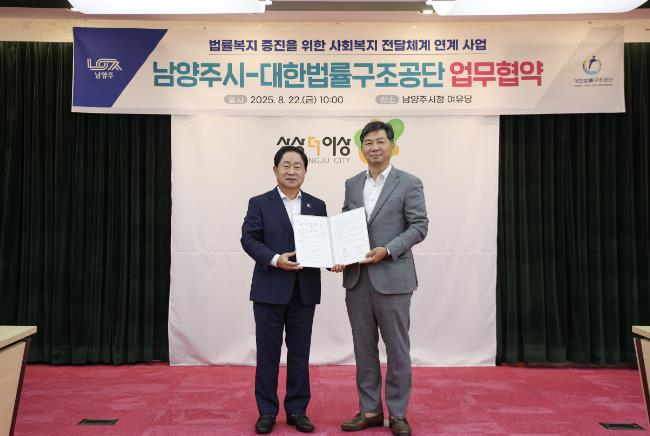 [코리아 이슈저널=홍춘표 기자] 남양주시는 22일 시청 여유당에서 대한법률구조공단과 경기도 최초로 법률지원 서비스 체계 구축을 위한 업무협약을 체결했다.