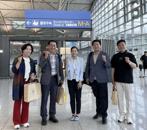 | ▲ 유니세프 그린스쿨 현장 방문단이 6월 30일 인천공항에서 몽골로 출발 전 파이팅을 외치고 있다.(사진 왼쪽부터 신계용 과천시장, 이용록 홍성군수, 조미진 유니세프한국위원회 사무총장, 임병택 시흥시장, 최재구 예산군수) |