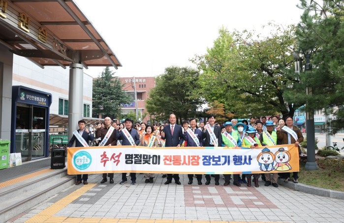 [코리아 이슈저널=김태훈 기자] 상주시는 추석 명절을 앞두고 경기침체로 어려움을 겪고 있는 전통시장 상인들의 사기 진작과 내수경기 활성화를 위해 10월 2일에 전통시장 장보기 행사를 진행했다.