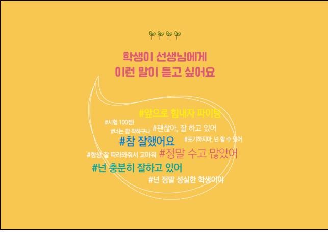 학생이 부모님에게 듣고 싶은 말은 '우리 딸·아들, 정말 잘했어', '항상 사랑한다', '넌 지금도 잘하고 있어' 순이었으며, 선생님에게서는 '참 잘했어요', '괜찮아, 잘하고 있어', '우리 함께 열심히 해보자'라는 말을 듣고 싶어하는 것으로 나타났다.