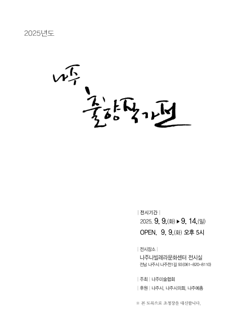 [코리아 이슈저널=김종오 기자] 전라남도 나주시가 지역 문화예술 발전과 작가들의 교류를 위해 마련한 ‘2025 출향작가초대전’이 9일부터 14일까지 6일간 나주나빌레라문화센터 전시실에서 열린다.
