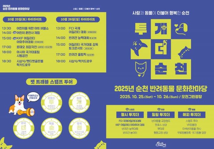 [코리아 이슈저널=김종오 기자] 순천시는 오는 25일, 26일 양일간 오천그린광장에서 반려동물은 물론 반려인과 비반려인이 함께 즐기는 ‘2025년 반려동물 문화한마당 행사’를 개최한다고 밝혔다.