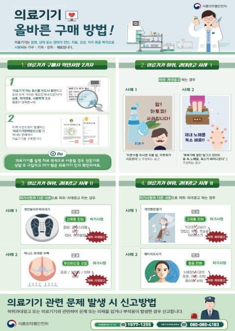 또한, 의료기기의 거짓·과대광고 또는 의료기기와 관련하여 피해를 입었을 경우 식품의약품안전처로 문의 가능하다.