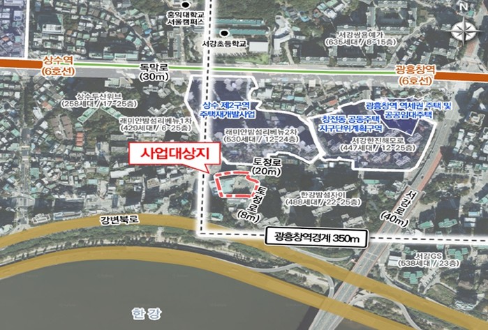 대상지는 지하철 6호선 광흥창역에 인접한 역세권으로, 서강대교와 강변북로를 통해 여의도 및 도심으로 빠르게 연결되는 교통의 요충지다. 특히 한강변에 위치하여 한강 조망과 개방감을 두루 갖춘 우수한 정주 여건을 자랑하며, 인근 주거 단지와 교육 시설이 밀집해 있어 주거 선호도가 높은 지역이다.