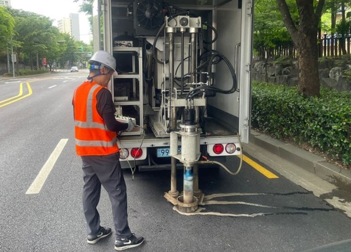 | ▲ 도로(아스팔트 콘크리트)의 두께 및 밀도 측정을 위한 시료 채취 모습 |