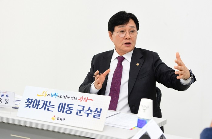 | ▲ 강화군, 초지대교 일원 상습 교통정체 개선 본격 추진(길상면 찾아가는 이동군수실에서 관련 민원에 대해 설명하고 있는 박용철 강화군수) |