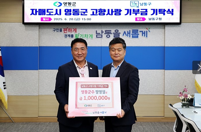 정영철 영동군수는 “고향사랑 기부를 통해 남동구 발전에 힘을 보탤 수 있어 기쁘다”라며 “국악의 고장 영동에서 열리는 영동세계국악엑스포에 남동구민의 많은 관심과 참여를 부탁드린다”라고 전했다.