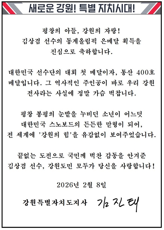 [코리아 이슈저널=최제구 기자] 김진태 도지사는 8일 2026 밀라노-코르티나담페초 동계올림픽대회에서 강원특별자치도(하이원 스포츠단) 소속 김상겸 선수의 남자 스노보드 평행대회전 은메달 획득을 축하하며, 축전을 보냈다.