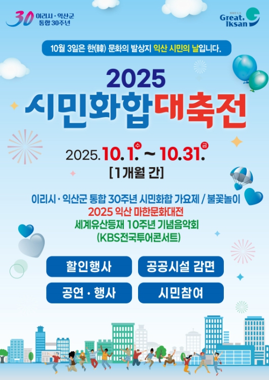 [코리아 이슈저널=김종오 기자] 익산시가 이리시·익산군 통합 30주년을 기념해 오는 10월 한 달간 '2025 시민화합대축전'을 개최한다고 24일 밝혔다.