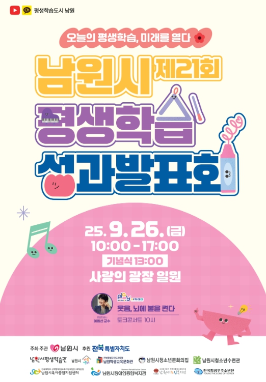 [코리아 이슈저널=김종오 기자] 남원시은 오는 26일 사랑의 광장에서 ‘오늘의 평생학습, 미래를 열다’를 주제로 제21회 남원시 평생학습 성과발표회를 개최한다.