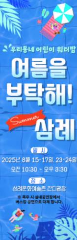 개막은 공연예술팀 ‘조이풀’의 타악 퍼포먼스로 시작해, 물총놀이·물북체험·물풍선 릴레이·어린이 EDM 풀파티 등 놀이형 체험이 이어진다.