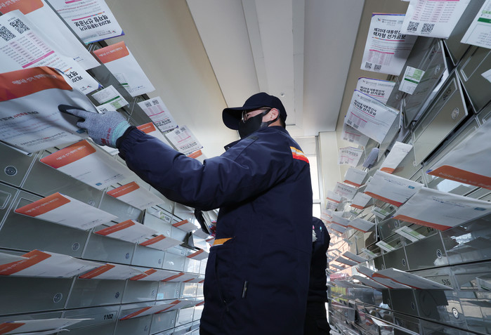 [열린의정뉴스 = 김윤영 기자] 22일 오전 서울 영등포구 한 건물에서 집배원이 제20대 대통령선거 선거공보물을 우편함에 배달하고 있다. 2022.2.22
