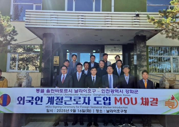 [코리아 이슈저널=홍춘표 기자] 강화군은 지난 16일, 몽골 울란바토르시 날라이흐구를 공식 방문해 ‘외국인 계절근로자 도입에 관한 협약(MOU)’을 체결했다고 밝혔다.