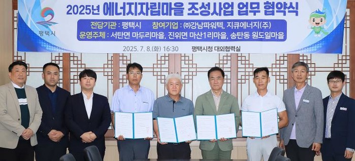 이번 협약에는 평택시가 전담기관으로 주관하며 최종 선정된 송탄동 원도일마을, 진위면 마산1리마을, 서탄면 마두리마을 총 3개 마을과 ㈜강남파워텍, ㈜지큐에너지 등 신재생에너지 설비 업체 2개 사가 참여했다.
