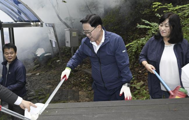 18일 회암사 약수터에서는 강수현 시장과 도시환경사업소장 등 관계자들이 참여해 낙엽과 쓰레기 등 오염원을 제거하고, 취수구 소독·방역 및 주변 시설 점검을 실시했다.