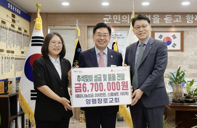 [코리아 이슈저널=홍춘표 기자] 양평군은 지난 23일 양평장로교회가 추석 명절을 맞아 어려운 이웃을 돕기 위해 320만 원 상당의 스팸세트 100개와 해피 나눔 성금 350만 원을 기탁했다고 밝혔다.