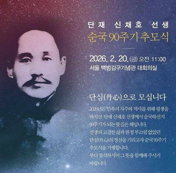 기념사업회는 "이번 순국 90주기 추모식은 단재의 정신을 정치·역사·가족의 기억하라는 세축에서 조명하는 자리"라며 "대한민국의 정신적 뿌리를 다시 확인하는 공공기억의 장"이라고 말했다. 암울했던 시기, 언론과 역사를 무기로 일제에 맞섰던 그의 치열했던 삶과 사상이 오늘날 우리에게 던지는 의미를 되짚어본다.