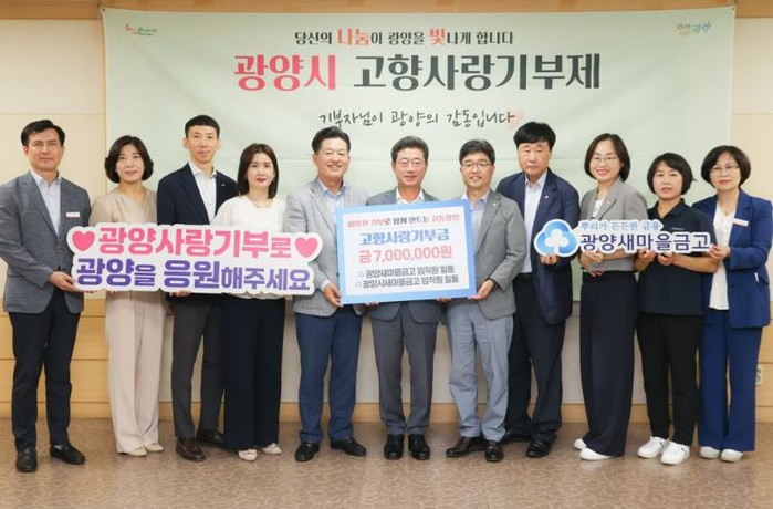 [코리아 이슈저널=김종오 기자] 광양시는 7월 14일 광양새마을금고와 광양시새마을금고 임직원들이 새마을금고여수시협의회와 함께 고향사랑기부제 상호 기부에 동참해, 총 700만 원의 고향사랑기부금을 기탁했다고 밝혔다.