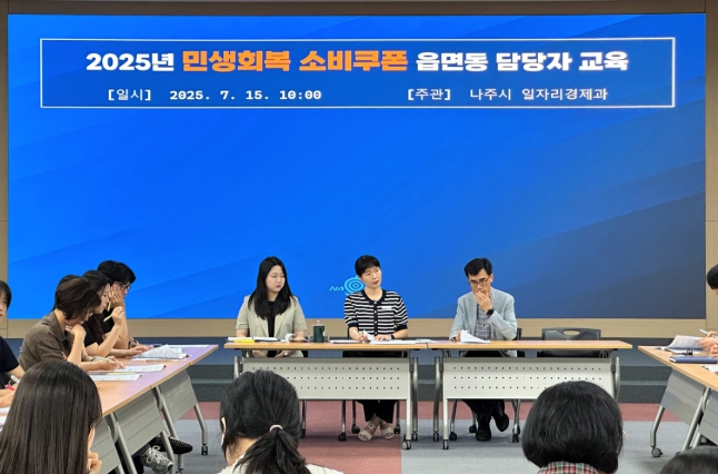 나주시는 지난 15일 대회의실에서 읍면동 행정복지센터 담당자 및 콜센터 직원 등 50여 명을 대상으로 민생회복 소비쿠폰 지급 준비 교육을 실시했다고 16일 밝혔다.