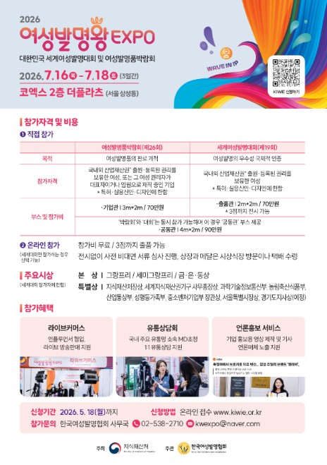 [코리아 이슈저널=최용달 기자] 지식재산처와 한국여성발명협회는 2026년 7월 개최되는 ‘2026 여성발명왕EXPO’에 참가할 여성발명·기업인들을 4월 6일~5월 18일까지 모집한다고 밝혔다.