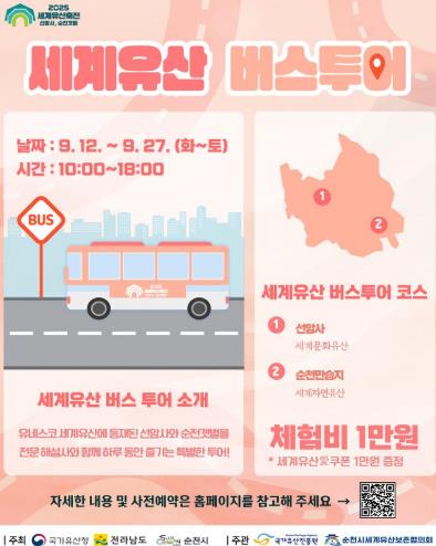 [코리아 이슈저널=김종오 기자] 순천시와 순천시 세계유산보존협의회는 오는 12일부터 27일까지 ‘2025 세계유산축전 선암사, 순천갯벌’ 버스투어 프로그램을 운영한다고 밝혔다.