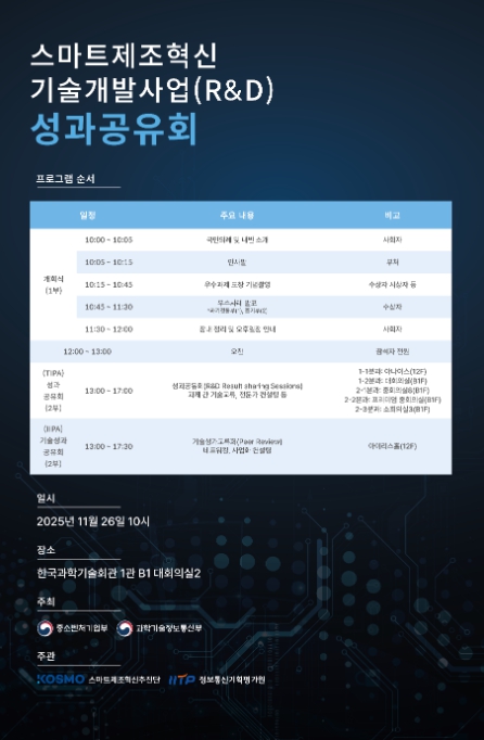[코리아 이슈저널=최용달 기자] 과학기술정보통신부는 중소벤처기업부와 함께 중소기업의 지능형 제조(스마트제조) 역량 고도화를 지원하기 위해 추진 중인 ‘지능형 제조(스마트제조) 혁신 기술 개발’ 사업의 성과를 공유하고, 제조 현장 확산을 위한 성과공유회를 11월 26일 한국과학기술회관에서 공동으로 개최할 예정이라고 밝혔다.