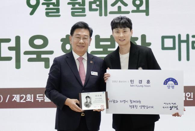 [코리아 이슈저널=홍춘표 기자] 양평군은 3일 군청 대회의실에서 열린 9월 월례조회에서 가수 민경훈을 양평군 홍보대사로 위촉했다.