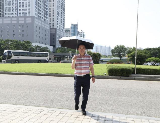 | ▲ 최대호 안양시장이 쿨맵시 데이를 맞아 가벼운 옷차림에 양산을 쓰고 출근하고 있다 |