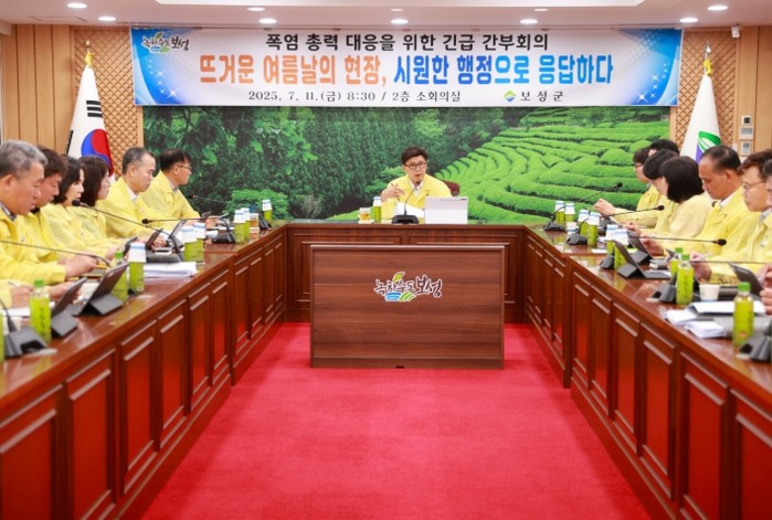 [코리아 이슈저널=김종오 기자] 보성군은 11일 오전 군청 2층 소회의실에서 전 실과소장이 참석한 가운데, ‘폭염 총력 대응을 위한 긴급 간부회의’를 열고, 전날 이재명 대통령의 “기록적 폭염에 가용한 행정력을 총동원해달라”는 당부에 신속히 호응했다.
