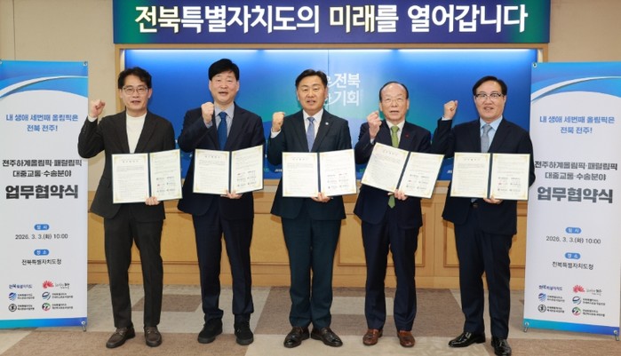 [코리아 이슈저널=김종오 기자] 전북특별자치도는 3일 도청 회의실에서 전주하계올림픽·패럴림픽 유치를 위한 대중교통·수송 분야 업무협약을 체결하고, 안전하고 체계적인 수송 지원 기반 마련에 본격 나섰다.