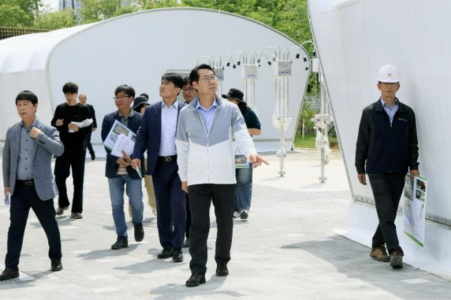 | ▲ 정명근 화성특례시장이 동탄패밀리풀 문화공원 현장을 점검하고 있다 |