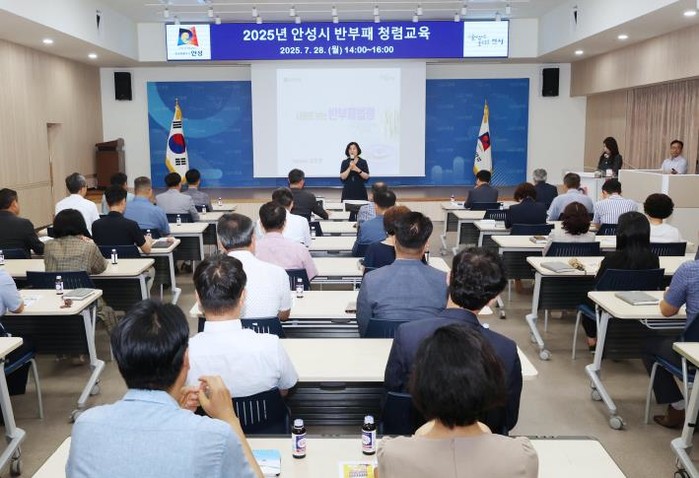 [코리아 이슈저널=홍춘표 기자] 안성시는 지난 28일 시청 대회의실에서 5급 이상 간부 공무원 50여 명이 참석한 가운데 반부패 청렴교육을 실시했다.