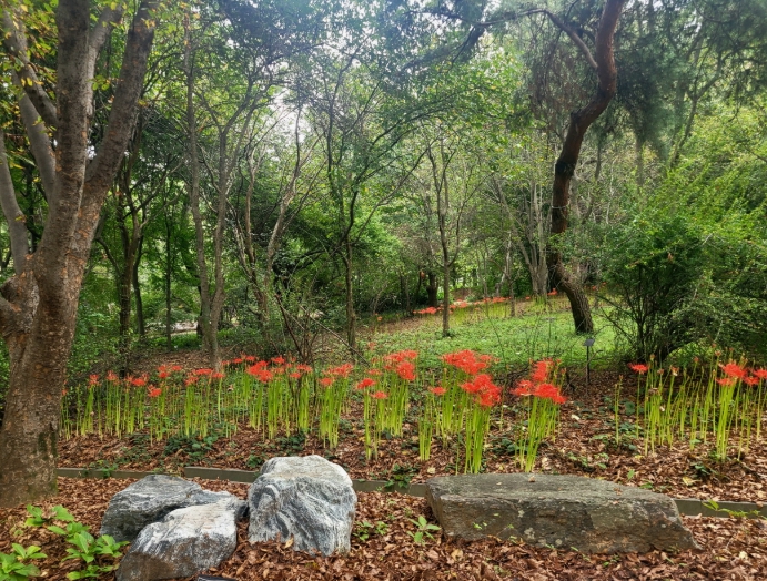 꽃무릇의 붉은 물결과 맥문동의 푸른 잎이 어우러진 풍경은 자연식물원을 찾은 방문객들에게 자연 속 휴식의 시간을 제공할 것으로 기대를 모은다.