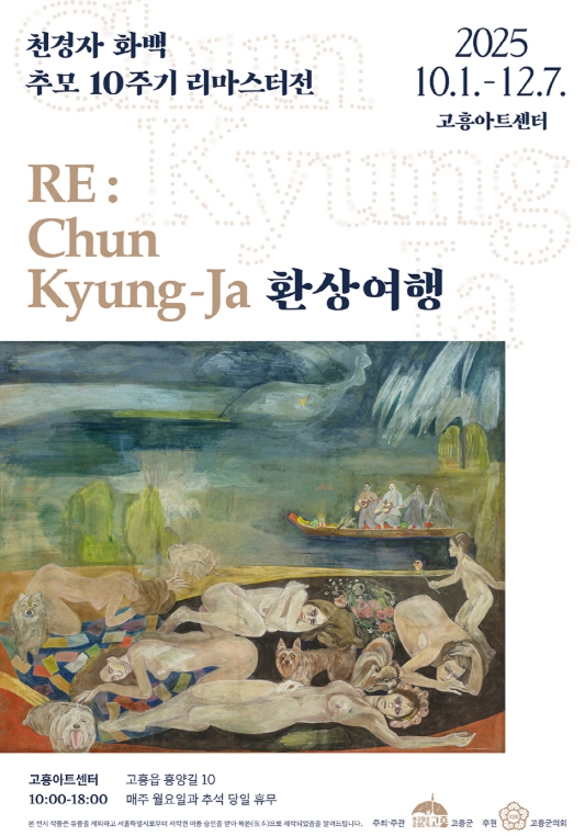 [코리아 이슈저널=김종오 기자] 고흥군은 오는 10월 1일부터 12월 7일까지 고흥아트센터에서 고흥이 낳은 세계적인 화가 고(故) 천경자 화백 추모 10주기 리마스터전 'RE:Chun Kyung-Ja 환상여행'을 개최하며, 10월 2일 오후 2시 고흥아트센터 1층에서 전시 개막식을 연다고 밝혔다.