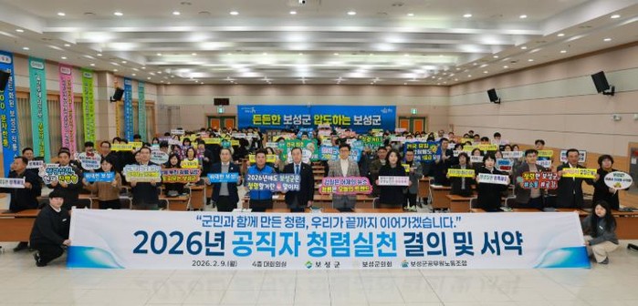 [코리아 이슈저널=김종오 기자] 보성군은 지난 9일 보성군청 대회의실에서 보성군, 보성군의회, 보성군공무원노동조합이 공동 참여한 ‘2026년 반부패·청렴 실천 결의 및 서약식’을 개최했다고 밝혔다.